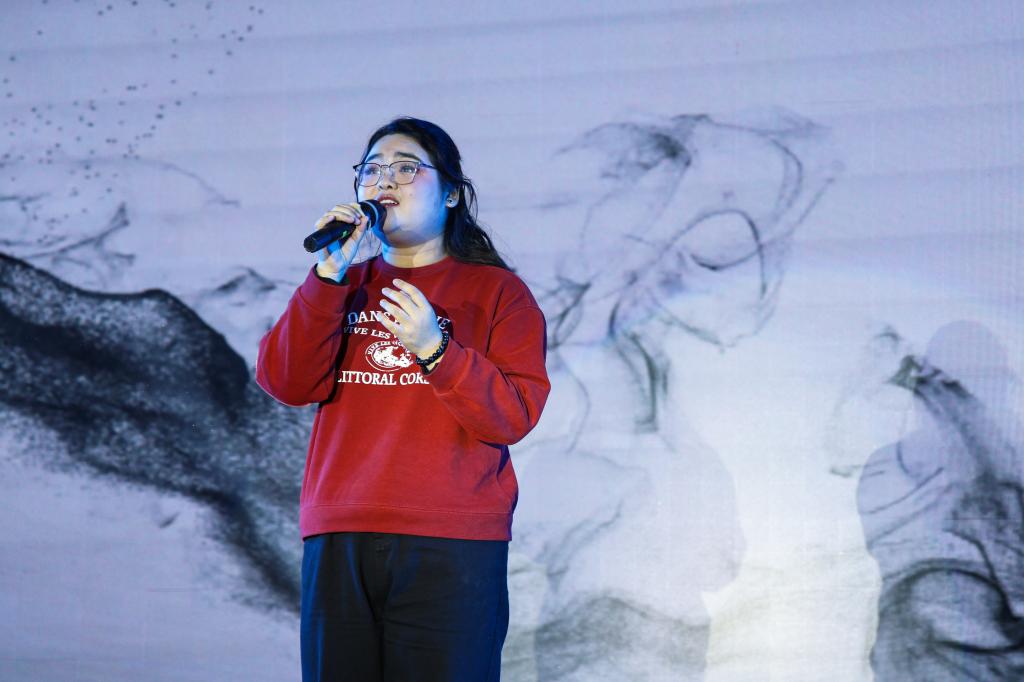 最后,现代港口贸易学院的蒋暄同学演唱了一首悲壮的爱国古风歌曲《赤伶》,展示了“位卑未敢忘忧国”的深厚报国情怀!