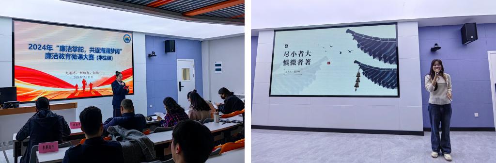 廉洁教育微课大赛以“廉洁掌舵,共逐海澜梦阔”为主题,在行政楼401会议室和海德楼4117教室分设教师组和学生组两个赛场。