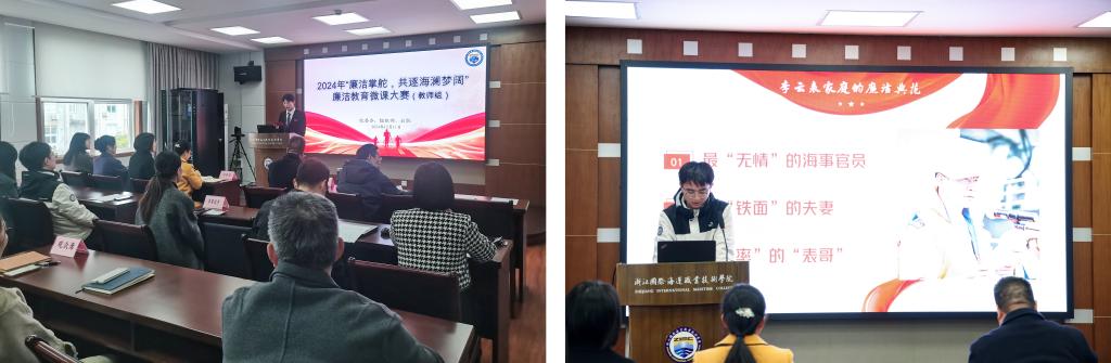全校各党总支(直属党支部)推荐的8名教师选手和9名学生选手结合舟山的海洋特色,以《廉“尺”》《清风廉韵传千古, 廉心筑梦照未来》《航向正直:航海教育中的廉洁与责任》《尽小者大,慎微者著》《传承蚂蚁岛精神,绽放廉政教育之花》《清廉之舟,家风领航》等为题,用生动的案例和动人的故事,将自己对于廉洁文化的深刻理解与独特见解娓娓道来。观众们也在这一堂堂精彩纷呈的微课引领下,感受着古往今来的廉洁力量,思考着如何在日常生活中践行廉洁,让廉洁成为学习和工作的底色。
