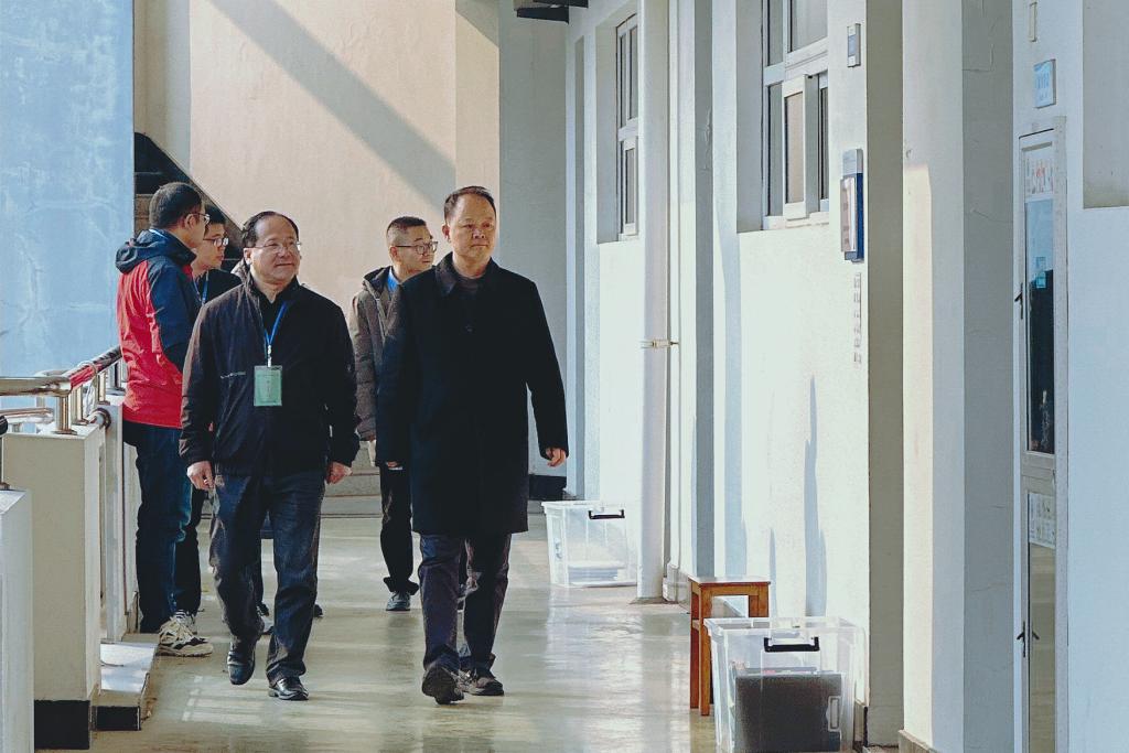 12月20日下午,校党委书记苏为泽、党委副书记孔志光,副校长李丽、曹志斌带领相关部门负责人到图书馆一楼集中安检区、考场区以及视频监控中心等相关场所检查指导考务准备工作,要求提高政治站位,提高服务意识,落实安全稳定责任,力争高质量、高标准完成研考考务工作。
