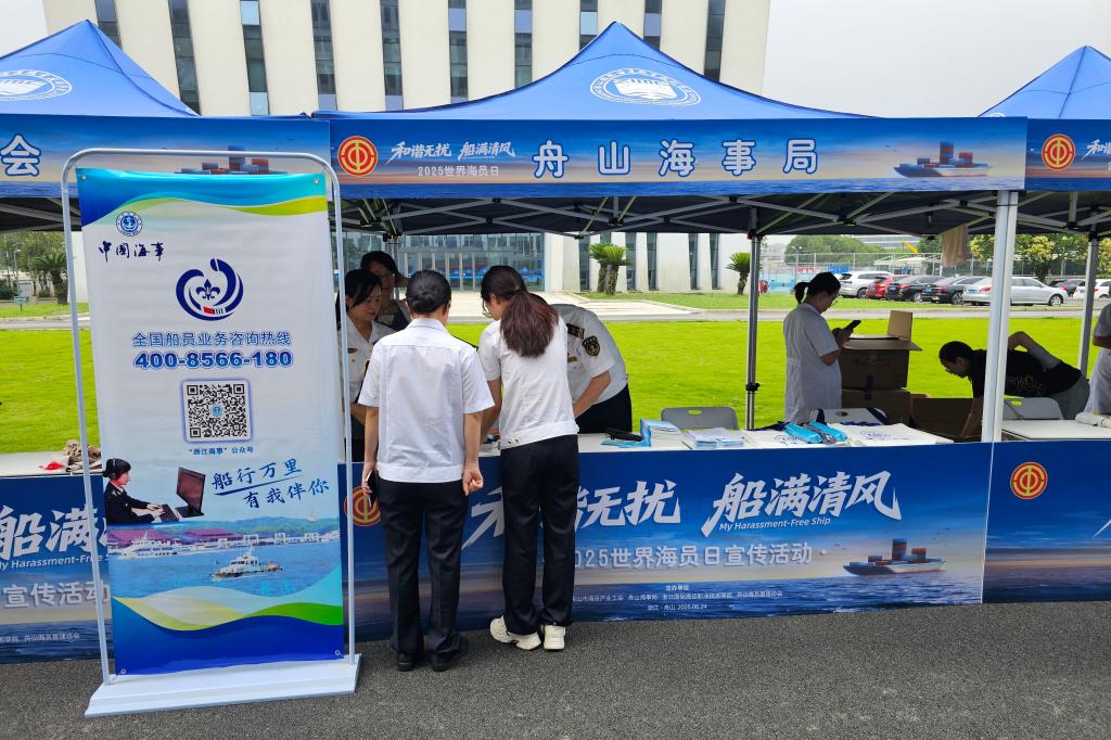 舟山市海员产业工会、舟山海事局、舟山海员管理协会联合学院组织开展的“和谐无忧,船满清风——2025世界海员日”宣传活动也于当天进行,通过户外设摊活动,向公众普及航海知识,关注海员权益,推动建立尊重、无骚扰的海上文化,增强公众对航海行业的了解与支持。