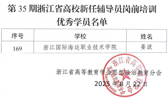 为深入学习贯彻习近平新时代中国特色社会主义思想主题教育,扎实推进“新时代立德树人工程”,加强一流辅导员队伍建设,全面提升辅导员队伍的专业素养和综合能力,8月15日至22日,我校5名新任辅导员参加了由浙江省教育厅主办的第35期浙江省高校新任辅导员岗前培训,并圆满完成学习任务。其中,航海工程学院的姜波老师荣获“优秀学员”称号。