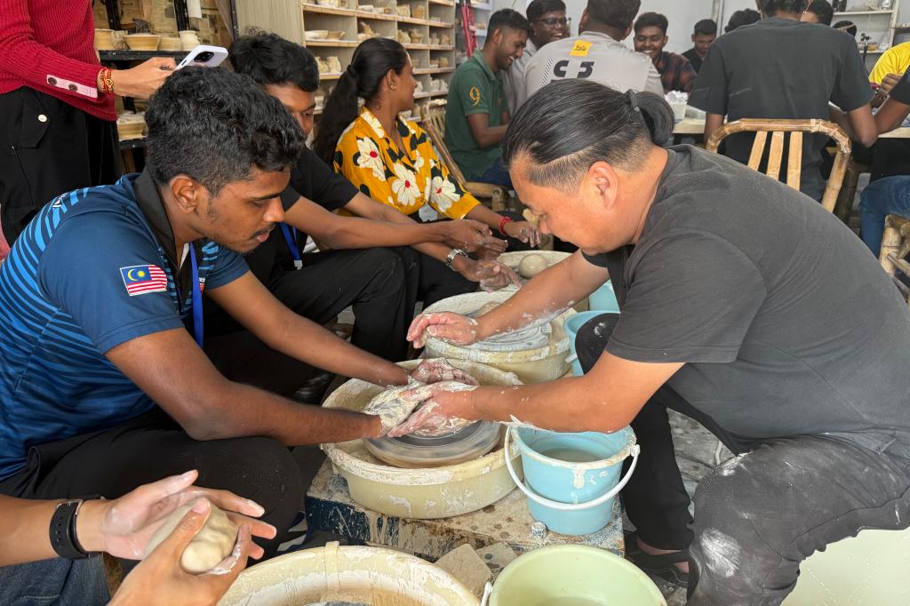 9月12日下午,在现代港口贸易学院罗兰老师的带领下,马来西亚学员们走进展茅路下徐村“听陶”陶艺工作室。活动特别邀请舟山工艺美术学院的丁朝夕老师担任指导,采用“一对一”教学模式,手把手传授陶艺拉胚技巧。学员们兴致盎然地尝试创作,还借助模具制作出带有鱼、虾等海洋生物图案的陶艺小样品,将舟山海洋元素融入作品之中。经过两天的精心烘干,9月15日上午,国际教育学院陈星蓉老师再次带队前往工作室,学员们拿起画笔、蘸取颜料为素胚创意上色,在斑斓色彩与巧妙构思中,深入体会舟山海岛陶艺的独特韵味。