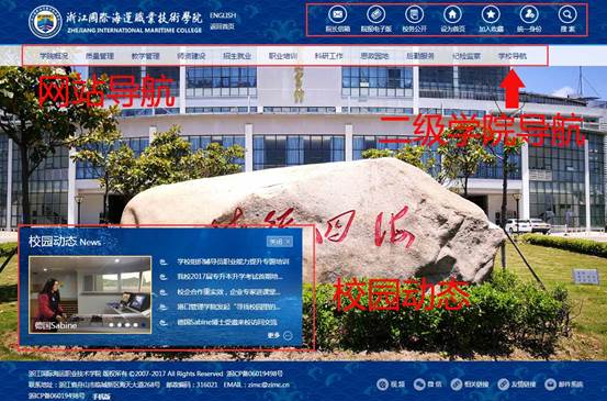 新网站采用了DIV+CSS技术,整体布局与旧门户网站类似。网站的左上方为学校logo,右上方分别为:院长信箱、院报电子版、校务公开、设为首页、加入收藏、统一身份认证系统入口和搜索功能。导航栏位于网站正上方,其中二级学院的导航在最右栏“学校导航”中,通过点击“学校导航”->“学院导航”即可进入学院列表。左下角为“校园动态”,点击关闭可将该版面收起,再点击“校园动态”即可重新打开该版面,点击“更多”可查看更多的校园动态,也可查看“要闻导读”、“校务公开”和“院报电子版”。