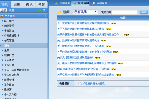 登入OA系统后,点击左侧“个人事务”->“新闻”,即可查看。