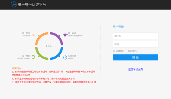 教师的登录帐号是工号或身份证号,初始密码是123456,学生登录帐号是学号或身份证号,密码是身份证后6位。教师工号和身份证号的字母都是大写,用户名和密码区分大小写。