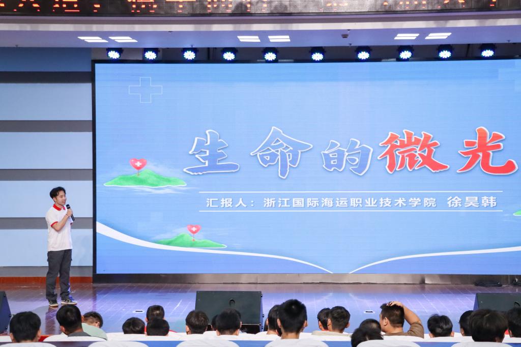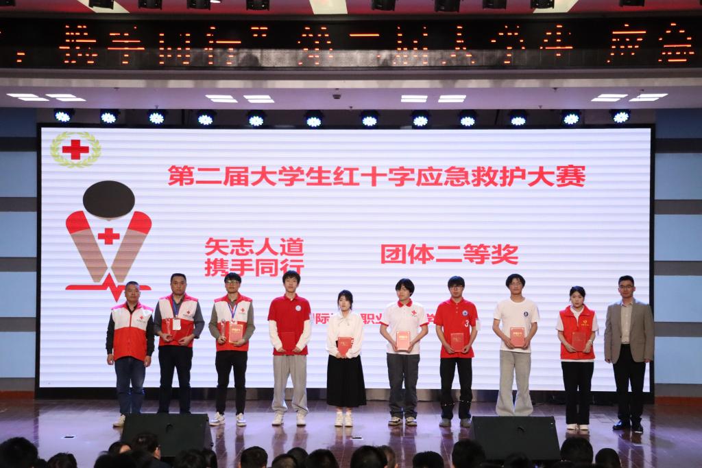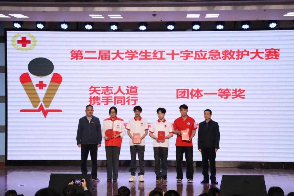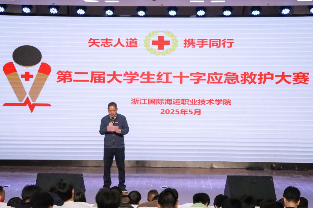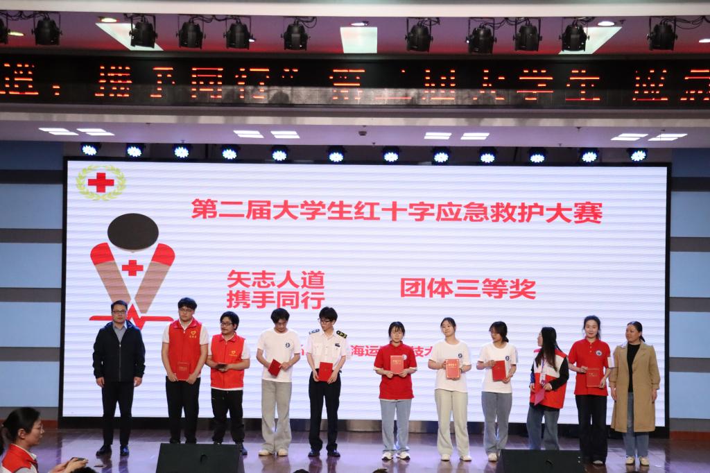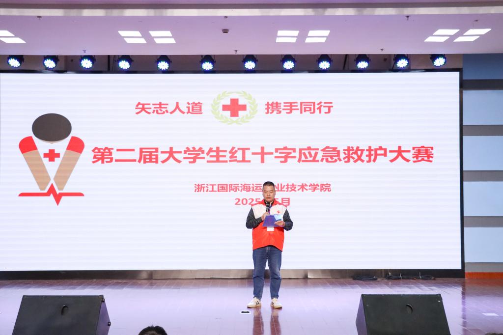 在第78个“世界红十字日”到来之际,5月7日下午,由校红十字会主办的第二届大学生应急救护大赛在图书馆4楼报告厅隆重举行。本届大赛以“矢志人道  携手同行”为主题,来自各二级学院的6支队伍同台竞技,最终石油化工学院凭借出色表现斩获团体一等奖,石油化工学院徐昊韩、胡志诚获救护演讲、创伤救护个人一等奖;海洋装备工程学院王行嘉获心肺复苏+AED使用个人一等奖。舟山市红十字会党组成员、副会长齐嘉辉,校党委委员、副校长、校红十字会长曹志斌、后勤产业处副处长毛攀峰及各二级学院副书记出席活动并为获奖团队颁奖,舟山市红十字会现场应急救护培训指导中心主任蒋朝进在致辞中强调,青年学子应传承红十字精神,以急救技能践行社会责任。