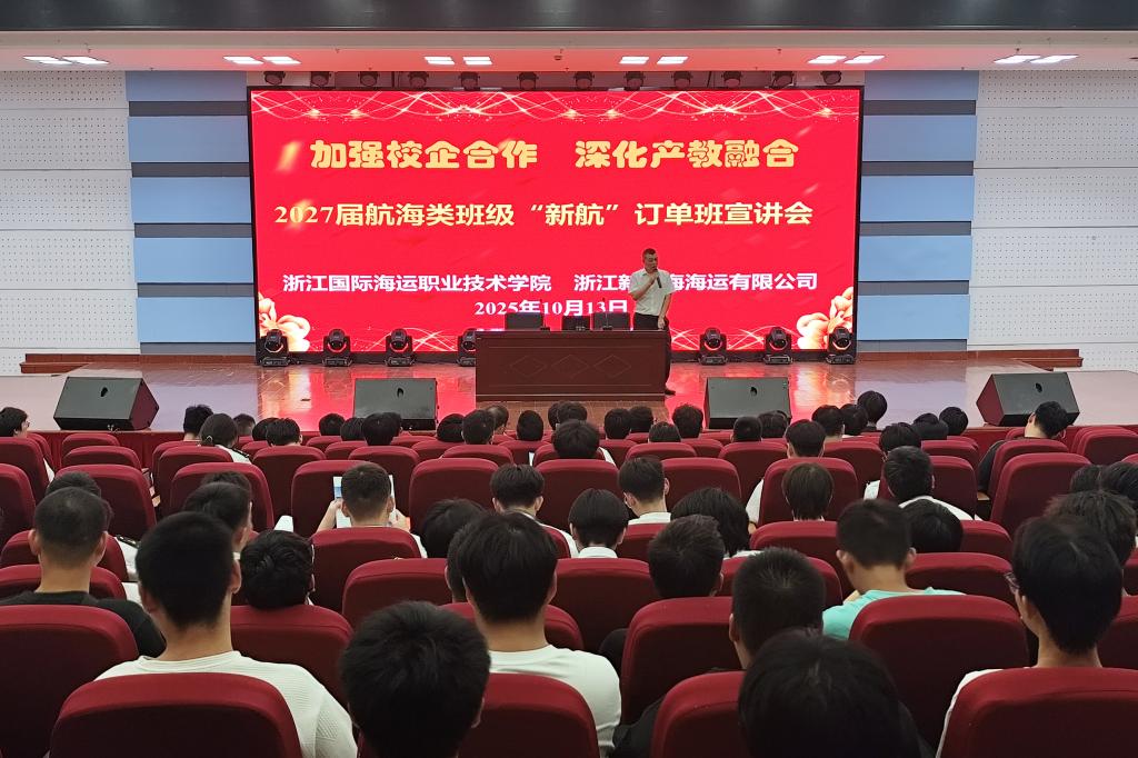 10月13日,航海工程学院2027届“新航”订单班宣讲会在学校图书馆报告厅顺利举行,400余名学院大二、大三航海类专业学生到场参会,现场座无虚席。本次宣讲会以“深化校企合作,共育航海人才”为核心主题,学院院长汪益兵、办公室主任姜波,以及浙江新一海海运有限公司副总经理周勇、顾学辉等企业代表共同出席,为学生搭建起校企协同育人的职业发展沟通桥梁。活动由学院副院长黄华主持。