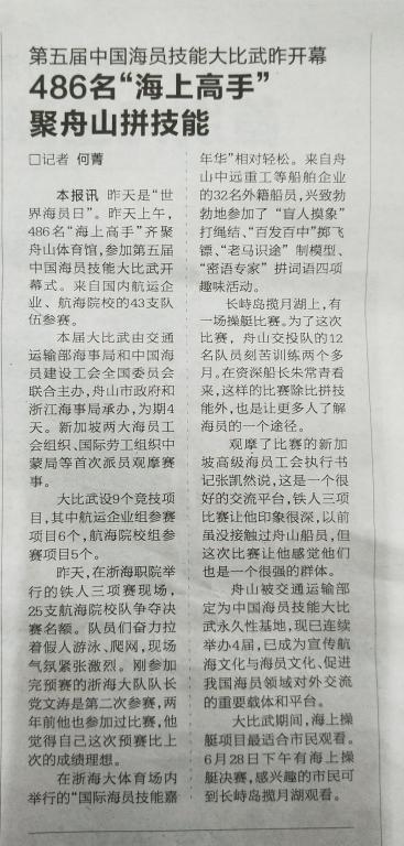 昨天是“世界海员日”。昨天上午,486名“海上高手”齐聚舟山体育馆,参加第五届中国海员技能大比武开幕式。今来自全国航运企业、航海院校共43支队伍参赛。