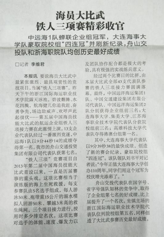 (2019年6月27日《舟山日报》头版 http://dhnews.zjol.com.cn/dhnews/system/2019/06/27/031739158.shtml)