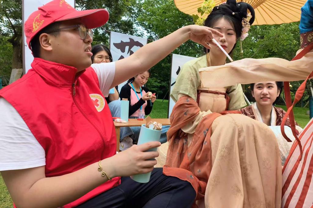 活动中,“小叶子”们各自分工,有的在文创展位为游客讲解非遗文化,有的在食品展位为游客提供小食,有的在集章游园活动中为游客盖章打卡,有的在活动演出场馆维持现场秩序,处处都能看见他们忙碌的身影。